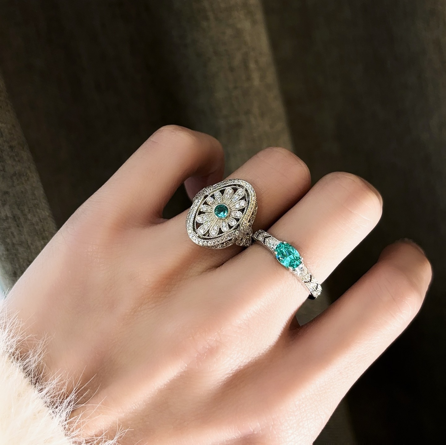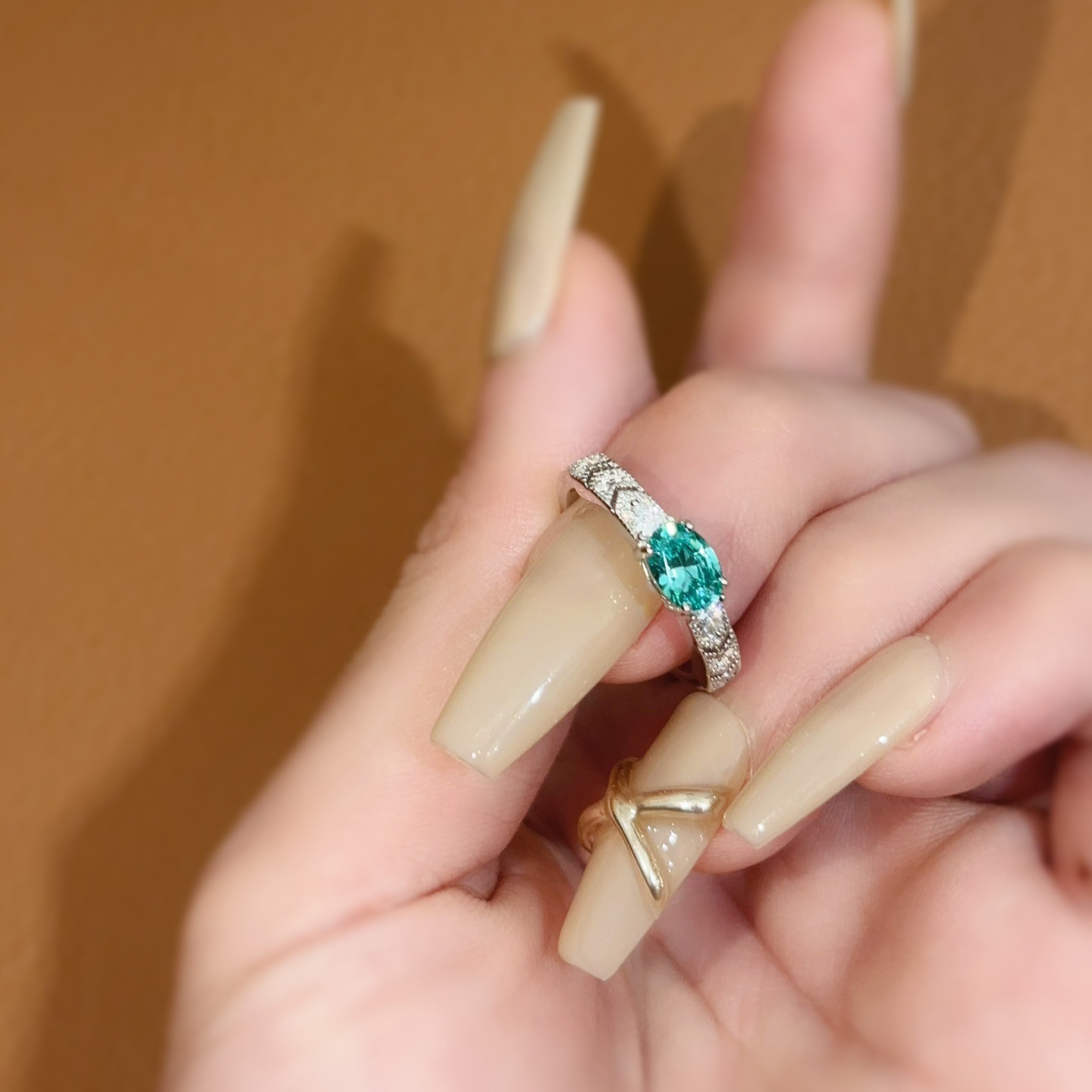 new✨帕拉伊巴色蛋形鑽戒✨(Paraiba ) 💕客來打版的彩寶款~超火😍 ✅️戒托就經過2次改良,小鑽在微寬戒臂上,呈V字排列,主石兩側也用兩顆梨形鑽襯托,表達的是都會女性的銳利風格和個性態度。 💕主石四爪橫鑲,1卡蛋形切割,訂製帕拉伊巴色主石(Paraiba),帕拉伊巴色石頭還是比較不穩定的,能有一批色調螢光感強且藍綠調的不容易, 要等要選還要高成本🥲看實拍效果,帕拉伊巴天然石天價,人工石已經很成熟的工藝,社交範圍難辨真假,小價位就能感受珍稀寶石帶來的電光火石感✨🎆 👉925銀鍍金材質,白金色配色不怕掉色 👉做了美碼5678碼 ✅️像一汪在手心裡的湖水,靜謐深邃,又帶著迷人的神秘色彩 ✅️我們這款挑選的帕拉伊巴色石,都是盡量往藍綠調去選,成本也略高,但是色調的螢光感會更優,光線下有著霓虹般的光芒 ✅️當然高級感絕對不是隨便就能有,人工石一樣有等級和好次之分,要精品就認準我們😉 ✅️實拍佩戴,鋒芒個性,輕奢體驗,這款是很適合日常上班的小鑽系列,低調又精緻,小輕奢即視感 ✅️圖中是兩款爆款復古風彩寶搭配,這一手😌誰還不是有品味的小富婆👀