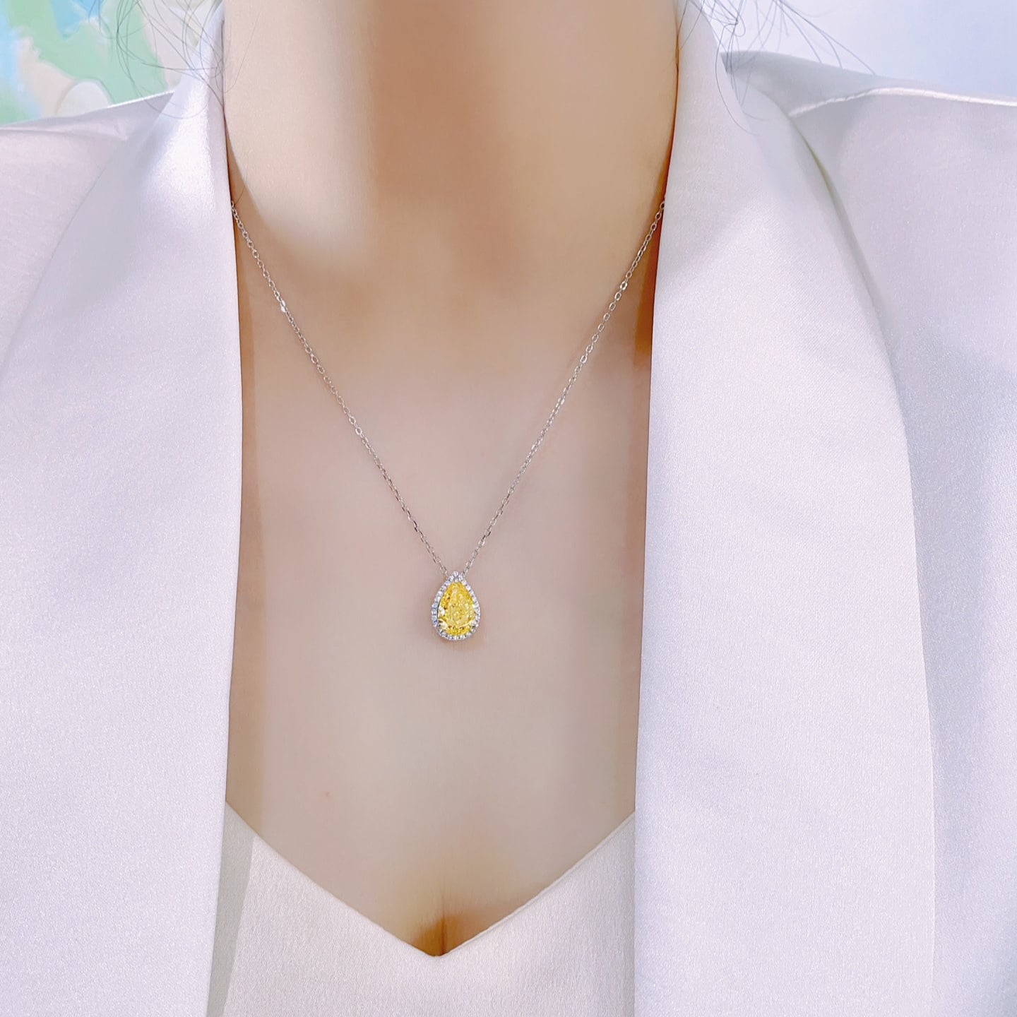 New✨水滴黃鑽圍鑲頸鏈/耳環✨ 💕想要一套完美吸睛的高訂晚會款一定要看過來😘女神款,燦若暖陽,美妙光暈定格浪漫瞬間。 精美黃鑽在水滴形設計的襯托下,充滿魅力個性色彩。 💕重工款式,訂製雷迪恩切割(Radiant Cut)鵝黃水滴鑽,手工打磨鑲嵌,效果深邃璀璨。 主鑽圍鑲一圈圓形切割頂級人造白鑽,視覺效果精緻華麗,鑽托鏤空設計,折射火彩閃耀。 金工標準執模拋光,真金真鑽即視感。 👉耳環式設計,靈動而高貴 👉925銀鍍金材質,白金色配色不怕掉色 👉耳環主鑽3卡 👉頸鏈鏈長40+5cm 👉頸鏈主鑽4卡 模特兒實拍✨ 耳環3卡主鑽,大氣又靈動,顯出氣場 頸鏈4卡主鑽,上身存在感滿滿,驚豔的珠寶即視感