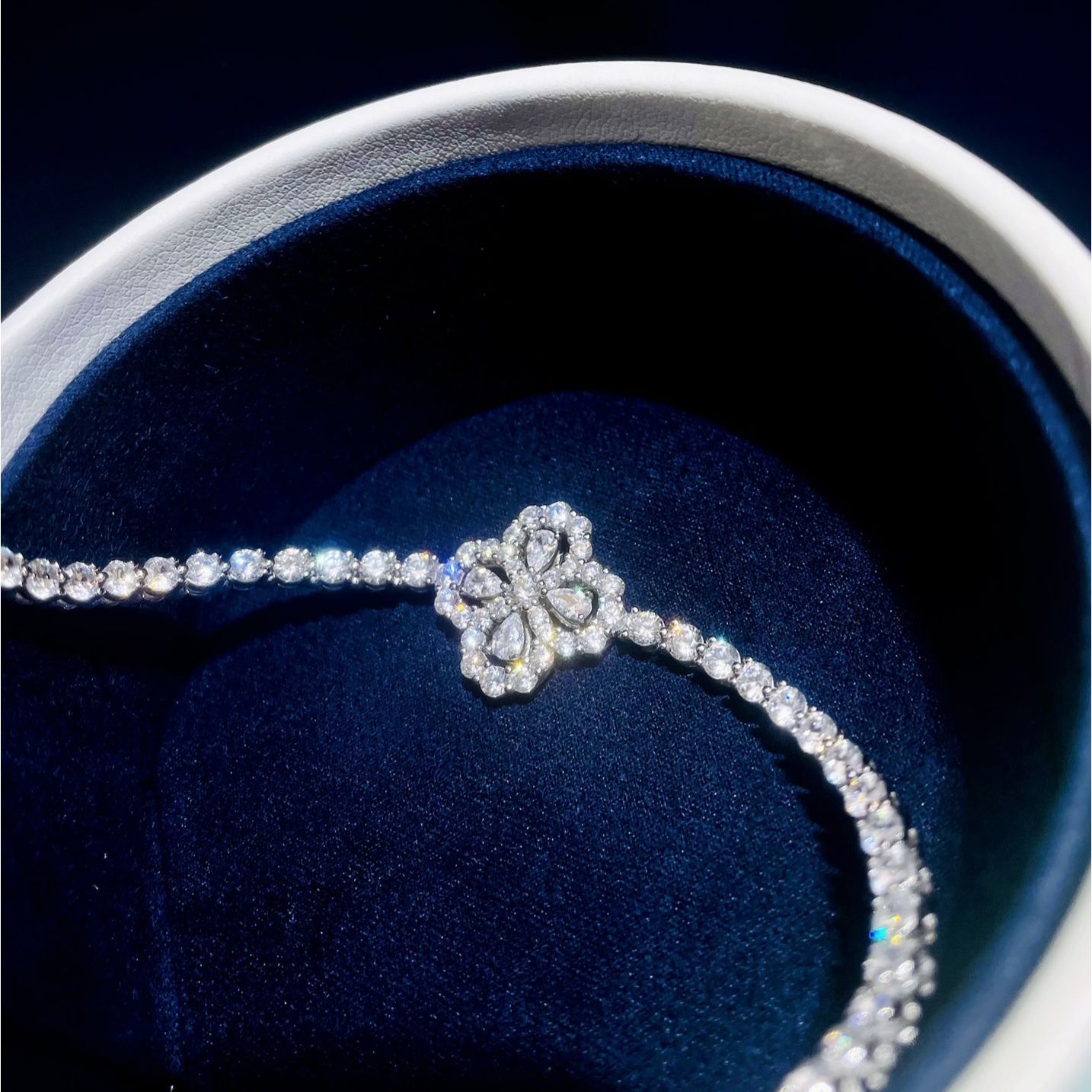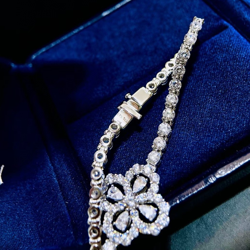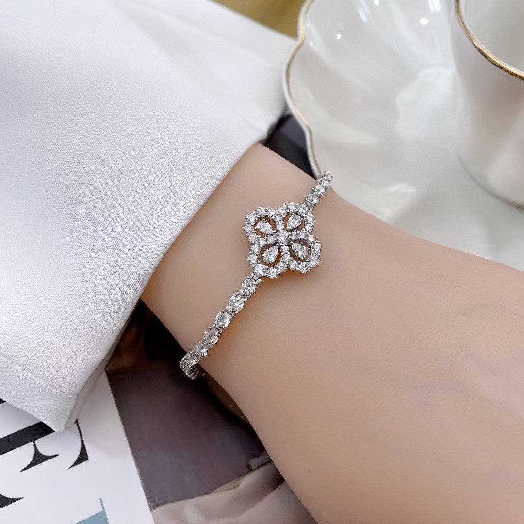 NEW✨花形鑽圈手鏈✨ 💕標誌性的花朵設計,由四顆精緻的水滴鑽,塑造了優雅的四葉花圖案。 整條手鏈均滿鑲5A頂級比利時BULINGBULING鑽,優雅秀氣又百搭。 💕版型周正,鏤空與鑽的比例在開版均做過多次微調,確保比例在合適的審美上👉微立體拱形的花朵形狀,花蕊點綴一顆水滴形鑽,耐看又有高級感。 💕重工重材料款式,925銀鍍金材質,白金色配色不怕掉色困擾 👉做了大小兩個碼,小碼16cm(適合15cm以內手圍),大碼18cm(適合16.5cm以內手圍) 落落大方的款式,你應該擁有🌸